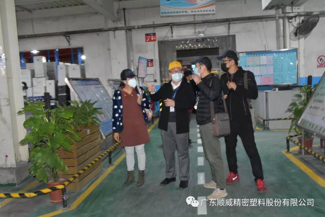 順威股份董事/總裁莫綺顏、董事/副總裁成再育、董事/副總裁/董事會秘書李笛鳴、工會主席/審計部總監童貴云、順德塑料分公司總經理范瑞強、順德模具分公司總經理龐利彬、集團戰略及商務中心/集團人力行政中心總監羅華、國內營銷中心總監助理/大客戶部高級經理王曉菲,一眾公司高管團隊在廠區廣場迎接中外媒體參觀團一行的到來。